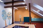 Kouzelné stromy pro školáčkyDalší práce, která nám umožnila vyřádit se s barvami, dát prostor fantazii pro výtvarné pojetí a vytvořit celkově vyvážené prostory pro malé školáčky. Křesťanská základní škola Elijáš zakoupila pro své malé studentíky dnes již historickou budovu, která se nachází v areálu pražského BB centra - kontrastně - téměř uprostřed moderních administrativních budov. Má své velké kouzlo, typická obecná škola ze začátku minulého století! Ovšem právě s ohledem na její stáří bylo potřeba budovu zmodernizovat a také rozšířit vytvořením dalších tříd přímo v podkroví školy. Při vytváření barevných vzorkovnic jednotlivých tříd i návrhů nábytkového vybavení jsme se rozhodli pro řešení pro školní půdu atypická, ovšem moderní, funkční a střízlivá. Speciálně jsme si dali záležet na výběru barev, aby třídy působily vyváženým dojmem a pozitivně se odrážely na dětské psychice. Kouzelné stromy v každé ze tříd a autorské řešení nábytku s hravými kulatými výřezy jen podtrhuje zamýšlený účel. Škola je vzhledem k vysokým investicím vybavována v jednotlivých fázích. Přiložené fotografie nabízí pohled do tříd I. stupně, časem přibudou další včetně pohledu do administrativních částí školy.